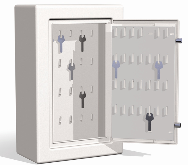 Utrustat med 32 långa krok i ryggen samt 24 standardkrok i dörren. Skåpet är avsett för väggmontage.